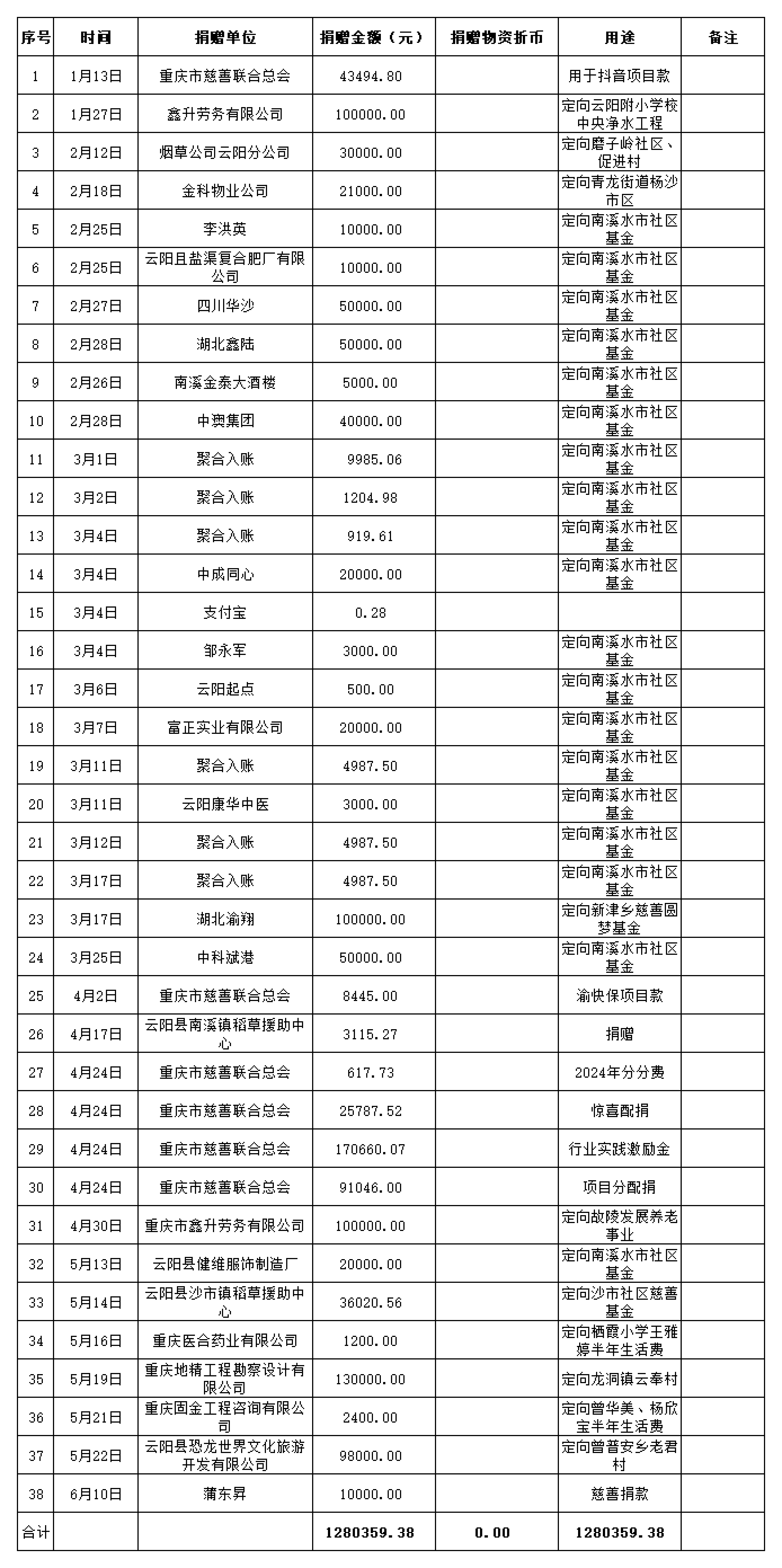 云阳县慈善会2025年接收捐赠款物明细表(1-2季度)